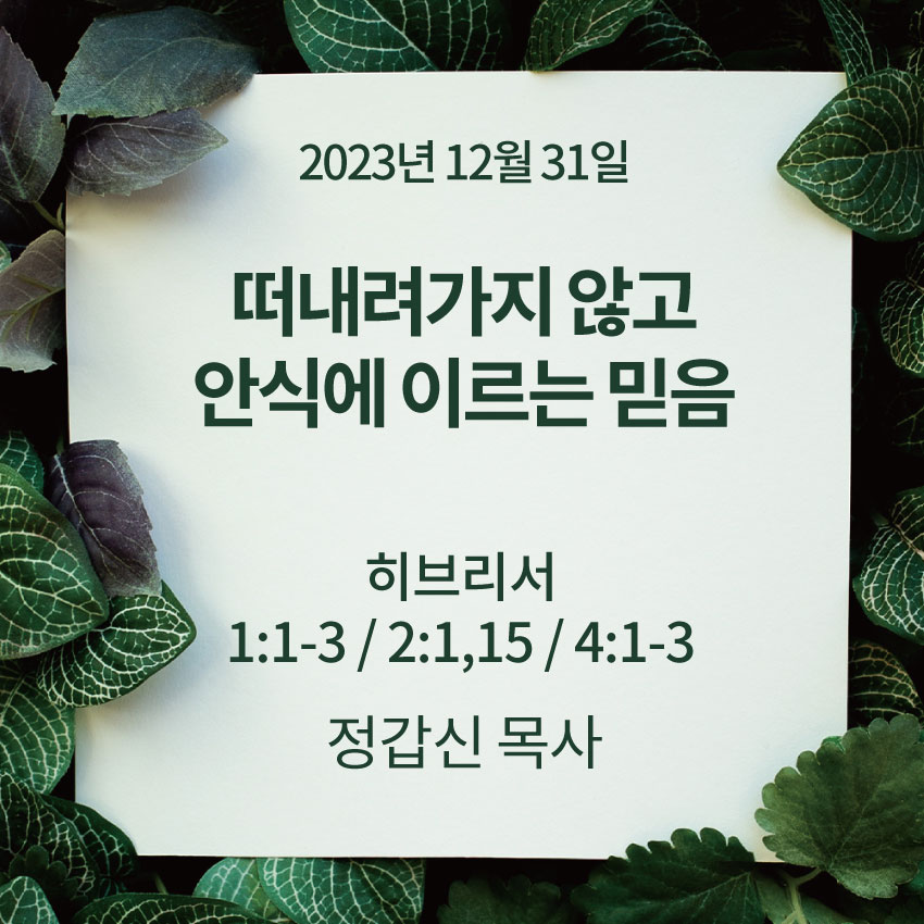 정갑신 목사ㅣ떠내려가지 않고 안식에 이르는 믿음ㅣ히브리서 1장 1-3절 / 2장 1절, 15절 / 4장 1-3절